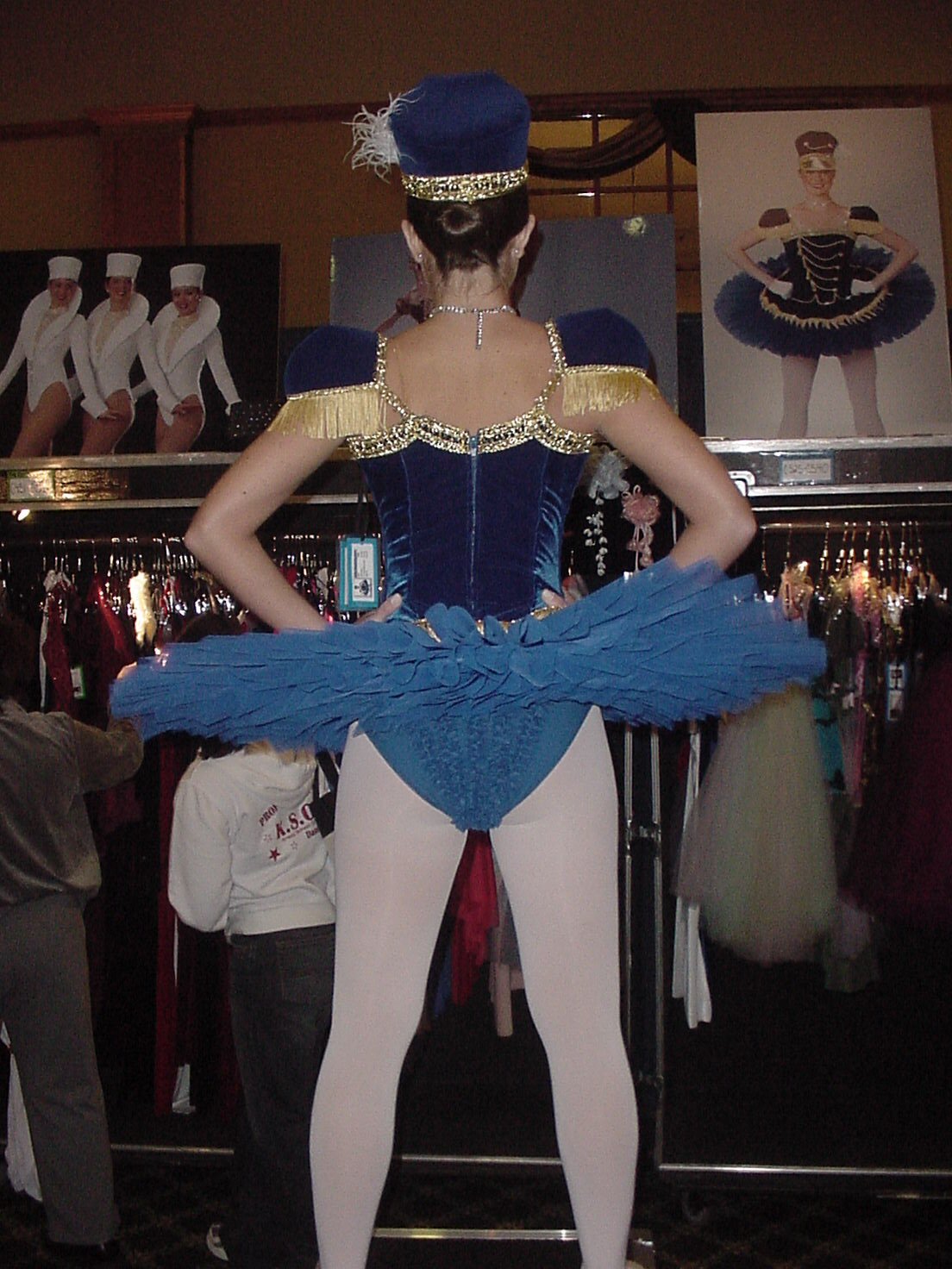 Margie, go ahead and put on some make up as if you were onstage and wear your pointe shoes. I'll have your costumes in a few moments. Mike knocks on the door: Margie your costumes are this rack outside the door. The numbers on the top of the hangers is the order. There are various colors and designs of tutus. Margie opens the door and Mike helps her slide the rack inside. Oh , they're beautiful Margie said. With you modeling them for us, are sales will be excellent Mike tells her. You see the full length mirror for you to check yourself. The steel plate here in front of the mirror is a static free device. It will reduce the static electricty when you stand on it. Just come out when you're ready with the first one ok.